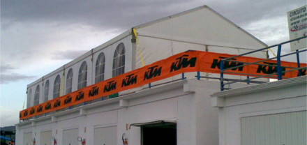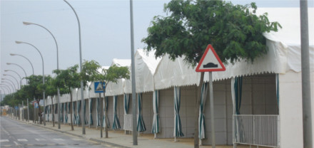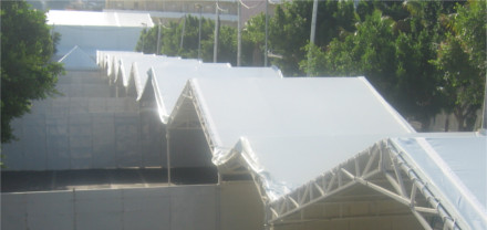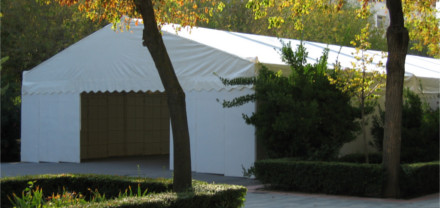 Dichas carpas están formadas por barras de aluminio, con una forma de cubierta a dos aguas, el montaje se realiza mediante la utilización de perfiles de aluminio en pilares y dinteles, y uniones metálicas entre piezas, utilizando pasadores metálicos y cruces de San Andrés con cables de acero. Cubiertas y cerramientos en lona de poliéster con inducción de PVC, tratamiento anti-moho y anti-ultravioleta, acabado anti-polvo a base de barniz acrílico en ambas caras, ignífugas M-2 Los cerramientos se pueden realizar en cortinas móviles de lona o rígidas mediante paneles metálicos. Las carpas tienen un pórtico (ancho) de 5m, 8m, 10m, 15m y 20 m y un largo ilimitado en módulos de 5m.