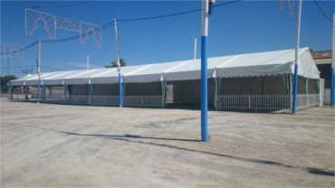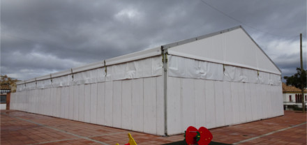 La estructura es metálica, estando constituida principalmente por pilares, jácenas, correas y tensores. Se han empleado en su construcción perfiles huecos de acero y barras cilíndricas macizas de acero, con alto límite elástico. Las uniones entre los diferentes elementos estructurales se realizan usando tornillos de alta resistencia y pasadores, permitiendo de esta manera el completar un rápido y fácil montaje. Cubiertas y cerramientos en lona de poliéster con inducción de PVC, tratamiento anti-moho y anti-ultravioleta, acabado anti-polvo a base de barniz acrílico en ambas caras, ignífugas M-2 Los cerramientos se pueden realizar en cortinas móviles de lona o rígidas mediante paneles metálicos. Las carpas tienen un pórtico (ancho) de 5m o 10m y un largo ilimitado en módulos de 5m.