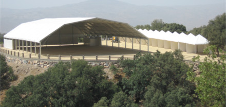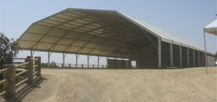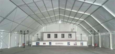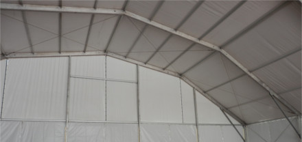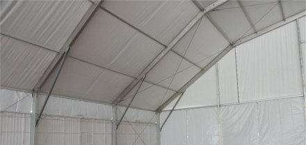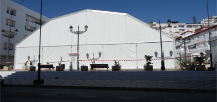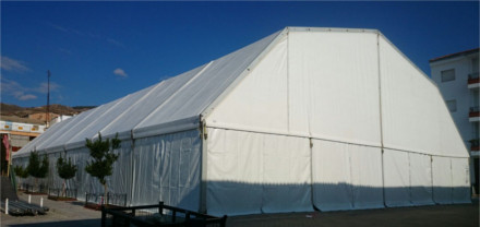 Dichas carpas están formadas por barras de aluminio, y una cubierta poligonal, el montaje se realiza mediante la utilización de perfiles de aluminio en pilares y dinteles, y uniones metálicas entre piezas, utilizando pasadores metálicos y cruces de San Andrés con cables de acero. Cubiertas y cerramientos en lona de poliéster con inducción de PVC, tratamiento anti-moho y anti-ultravioleta, acabado anti-polvo a base de barniz acrílico en ambas caras, ignífugas M-2 Los cerramientos se pueden realizar en cortinas móviles de lona o rígidas mediante paneles metálicos. Las carpas tienen un pórtico (ancho) 15m, 20 m ,25m y 30 m y un largo ilimitado en módulos de 5m.